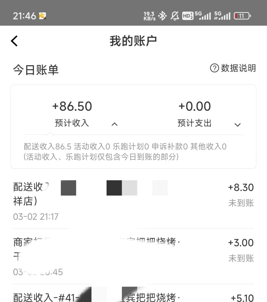 从下午 5 点 30 到晚上 9 点,一共跑了 9 单,共计收入 86.5 元,期间没有发生什么不愉快的事情,然后就去烧烤店点了些烧烤,美滋滋的回家了。